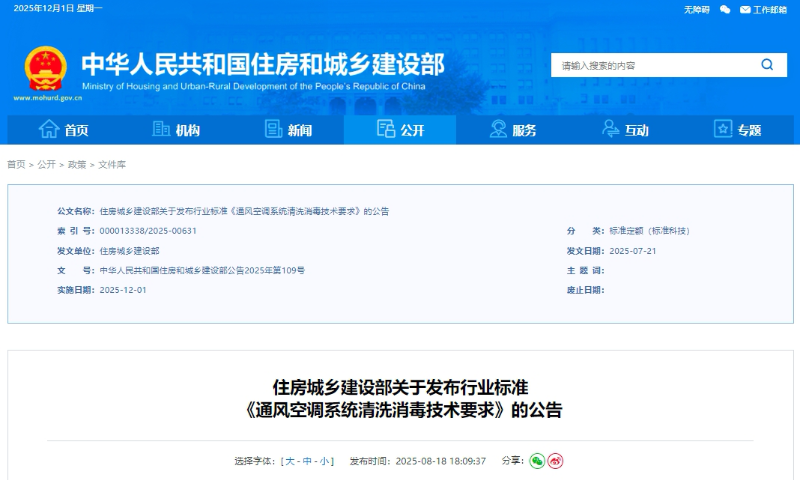 住房和城乡建设部《通风空调系统清洗消毒技术要求》行业标准,12月1日起正式实施